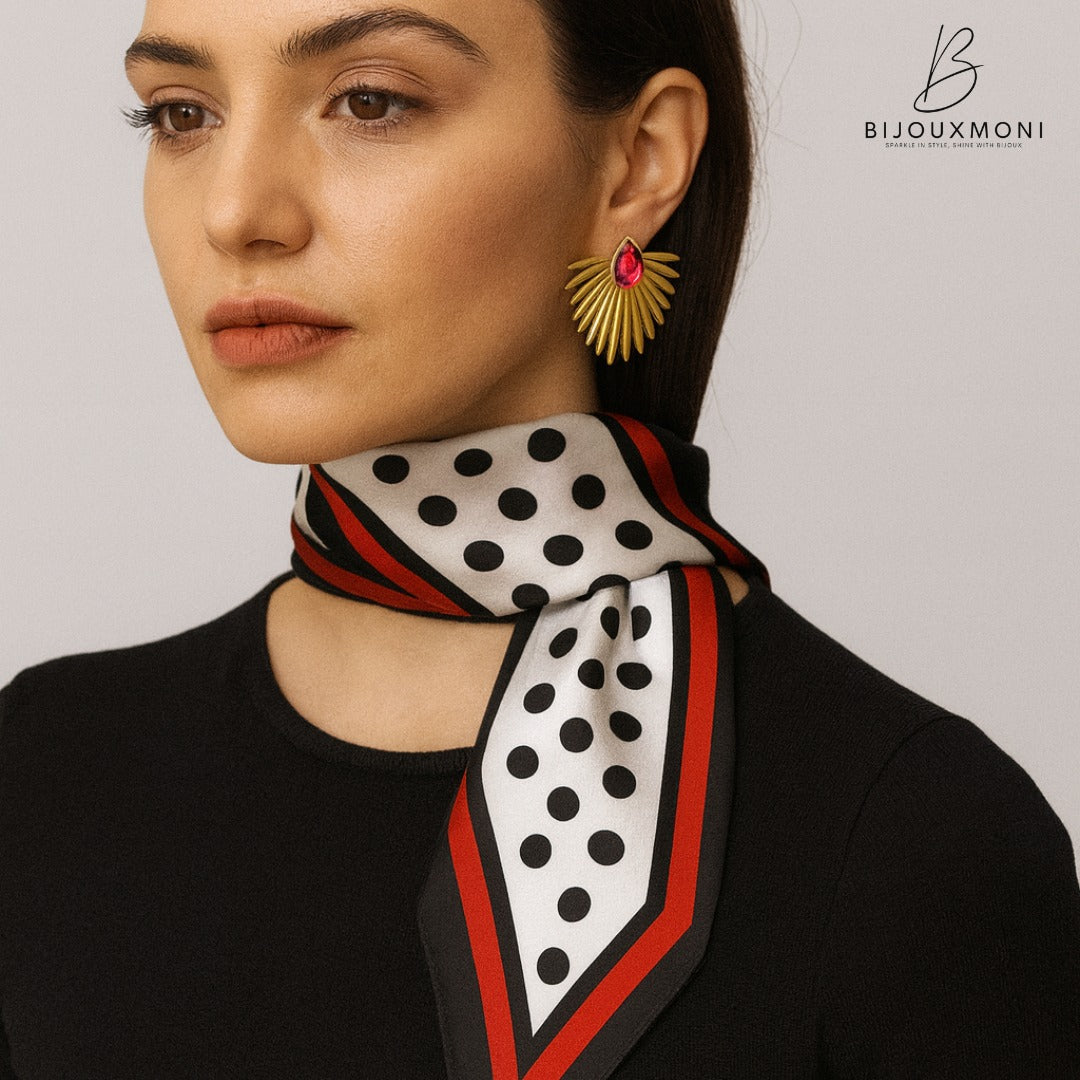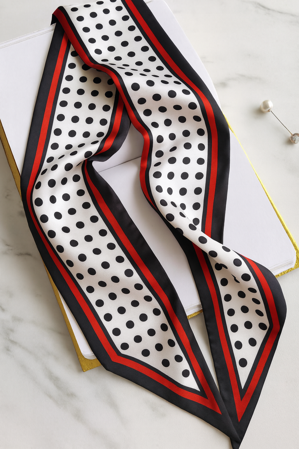 Turn heads with this sleek and sophisticated polka dot scarf, designed to add a bold, retro-inspired twist to any outfit. Crafted from smooth, silky fabric, it features a striking black and white polka dot pattern framed by elegant red and black borders. With a length of 144 cm and a width of 13 cm, it’s the perfect accessory to tie around your neck, wrist, ponytail, or handbag. Lightweight and versatile, this scarf brings effortless charm and chic flair to your everyday style.